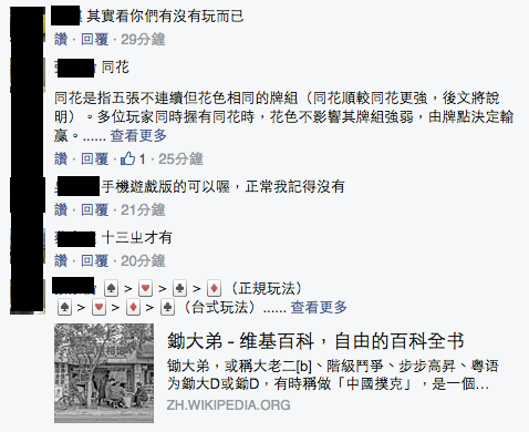 相信在大家的認知當中,大老二是沒有「同花」這個東西!不過下面有些「答案」卻讓人看完超傻眼!雖然有部分人士認真回答「不行出同花」但卻也有人表示「馬來西亞可以」「手機版可以」甚至是「十三支可以」等無關緊要的答案…. 不過也有人認為,只要「講好規則」就可以出同花,這則貼文也在方才引發爭議!