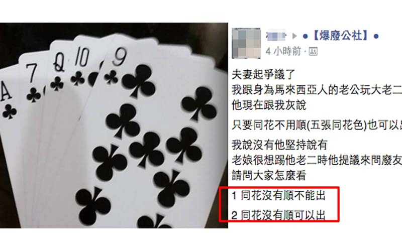 一名女子今天在臉書「報廢公社」表示,他和身為馬來西亞人的老公玩大老二,沒想到對方竟然跟她扯說就算「同花」沒有順一樣可以出!她堅持沒有,不料雙方卻在家起爭議了!