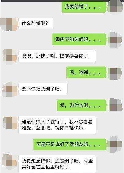 有人說,兩個人分手後如果還能做朋友,要么就說明彼此沒有深愛過,要么就是一個人還深愛著另一個人。不管這句話到底是對還是錯,分手後如果得知前任要結婚了,又或者是收到了前任的喜帖,這都會是一件讓人尷尬又黯然傷神的事。有網友給前男友發句“我要結婚了”,回复讓人心酸,含淚的祝福最無奈!