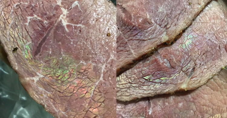 牛肉怎麼會出現這樣綠綠粉粉的神祕光澤?這種光澤有著金屬感,看照片更像是魚鱗、孔雀羽毛會反射出的顏色!看看冰箱裡剩下的也都是這樣,不過牛肉聞起來沒有臭味,是壞了嗎?可以吃嗎?