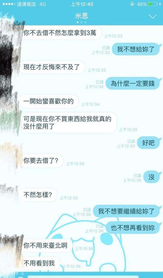 前男友推託說自己沒錢,可拜金女還要他「拿大學的學費啊,反正再向你媽拿就好」、「先去跟別人借」,最後乾脆直接撕破臉皮,嗆前男友「你當我陪你幾個月都不用錢?」(怒)
