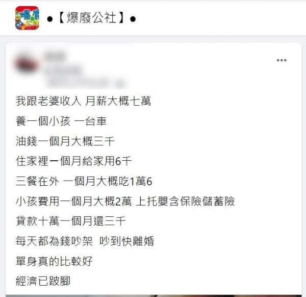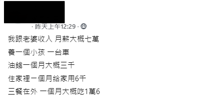 據媒體報導,這男網友在臉書社團「爆料公社」發文說,跟老婆住在家中沒有額外租屋的開銷,目前養一個孩子跟一輛車子,兩人收入合計共7萬元,雖然生活還過得去,但是每個月的開銷也成為不小的負擔,除了伙食費1萬6000元,還有油錢3000元、貼補家用6000元,最後貸款3000元,尤其養孩子還有更高額的費用,釣出一票網友都出來吐苦水了!