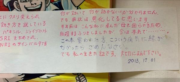 據「黨和」PO文表示,最近到亞馬遜二手書店淘書,買回了整套《赤腳阿元》回家,殊不知當他打開第3集準備閱讀時,卻發現書內夾著一張小紙條,抽出一看,上面寫著,「當你在看這本書時,代表我已經不在了,我目前正在接受精神治療,卻被剛畢業的醫生帶去做人體實驗,每月換不同新藥實驗,現在正在吃SNRI的欣百達,但病情卻惡化了,這紙條是我活著的證據,請好好地看」,並標記了2013年12月1日。