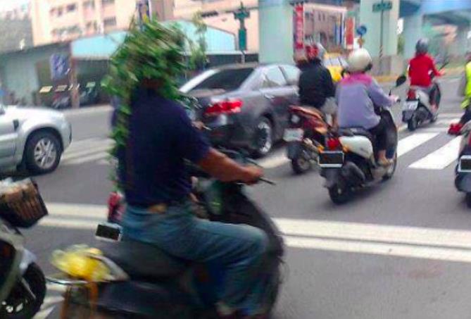 拉近一看,小哥不知道從哪邊的樹叢都抓了兩把樹葉,直接就戴在頭上,還被拍了下來,照片一傳到網路上讓網友一看全笑翻。