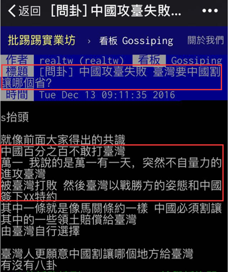 台灣網民已經在討論「開戰」,角度還很感人——如果大陸戰敗,要割讓哪些省份給台灣。