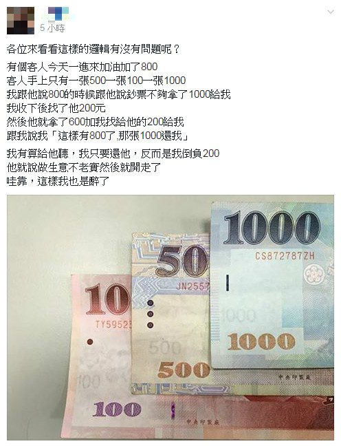 沒想到客人拿了200塊後,跟手上的100塊和500塊合起來,對原PO說:「這樣有800了那張1000還我。」