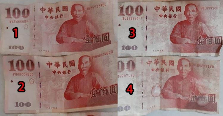 話說現在假鈔技術越來越厲害了,收到鈔票前真的要看仔細啊!我就曾親眼看過身旁的人,付錢才發現1千元是假鈔,當下真的超嘔,重點往往也記不得是什麼時候、跟誰拿到的。「爆料公社」就有網友分享一張照片,考考你看得出來,這4張只有1張是真的嗎?