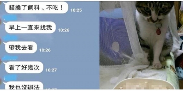 這位網友在社團「貓咪也瘋狂」PO文分享,有一天她出門時間比較長,就交代媽媽要幫貓咪換飼料,過了一段時間後,媽媽傳LINE提出疑問,說貓咪就是不吃貓飼料,還一直看著飼料傻眼貓咪。