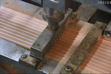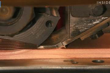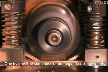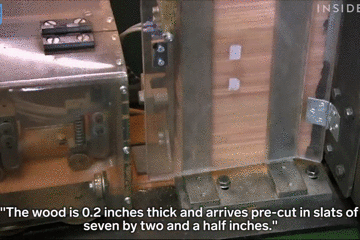 每一塊木板都要一一通過大的切割齒輪,速度很快,小心看花眼。
