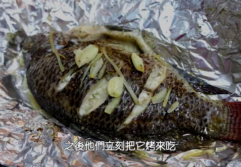 終於在黃昏時刻,他們釣到了一尾重約4公斤的吳郭魚,5人立刻開心將吳郭魚煮熟分食…