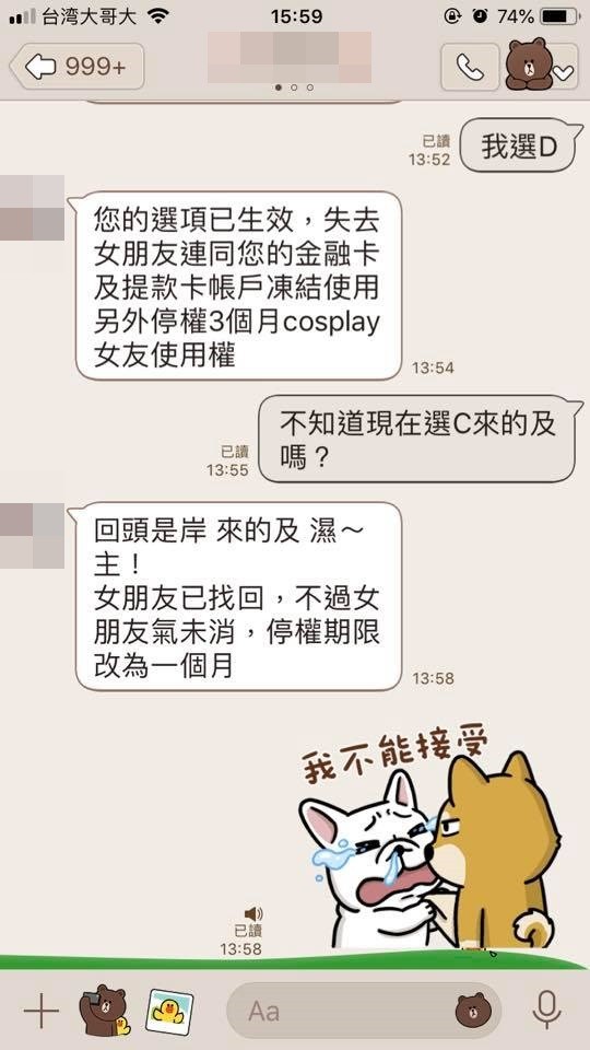 原PO看到訊息後故意回答「我選D」,女友則過2分鐘後回覆「您的選項已生效,失去女朋友連同您的金融卡及提款卡帳戶凍結使用,另外停權3個月cosplay女友使用權」。原PO緊張回「不知道現在選C來得及嗎?」結果女方雖然表示「回頭是岸,來得及,濕主(施主)!女朋友已找回」,但「女朋友氣未消,停權期限改為一個月」。