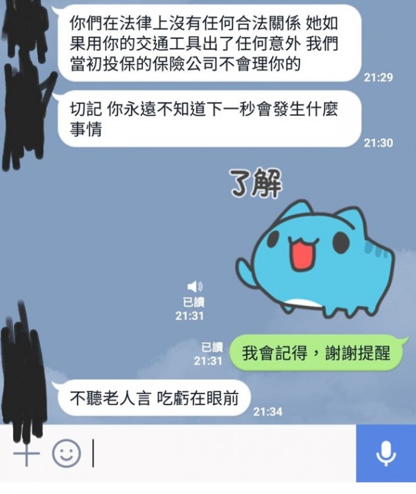 對於網友的疑問,爸爸老江湖的說,男女朋友在法律上沒有任何合法關係,對方騎車、開車如果出了任何意外,「我們當初投保的保險公司不會理你的。切記,你永遠不知道下一秒會發生什麼事情。」