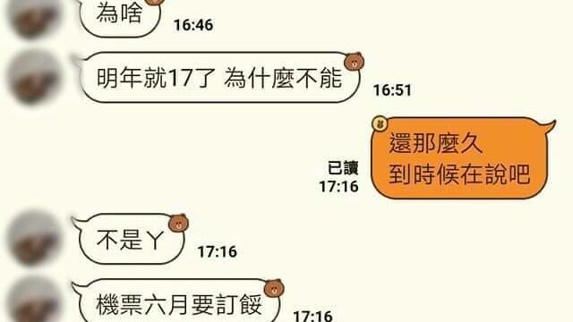 接著他說「現在17歲的女生不要馬上反對造成對立,加速孩子的決心,可以的話,建議從其他角度溝通,如其它國家或跟團之類的,再者從旅遊跟她聊起來,引導其它方式。如天數、國家等等。一分錢一分貨,出國最怕省東省西最後玩不盡興更甚安全問題。所以不用現在買票或報名,省不了多少。半年前大都是唬爛的。」