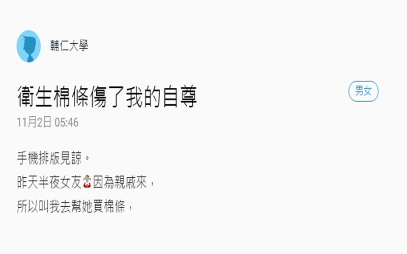 之前在南韓女生搭公車月經沿著大腿流下,隔壁暖男朝她潑草莓牛奶解圍的故事暖到無數網友,近日有女網友在Dcard上分享自己生理期不小心弄髒餐廳椅子,男友的超暖舉動讓她第一次有想要託付終身的感覺。