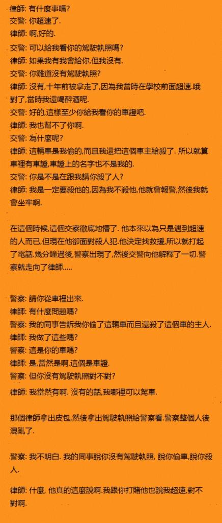 警官鎮靜地回答道:「因為警察局裡不僅有警察,還有許多律師走來走去。」