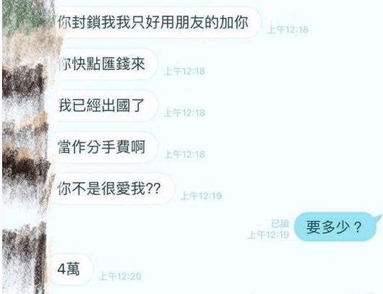 每個人都曾有過被愛情沖昏了頭的經驗,雖然分開的結局讓大家都非常難過,但是最讓人難堪的是,分手以後才看清自己前任的真面目啊!最近一組對話截圖在網路上爆紅,內文中的主角是一對已分手的戀人,而女主角居然在出國玩遊玩時,理直氣壯地向前男友要錢「當分手費」,讓網友都忍不住直呼「太扯了」!