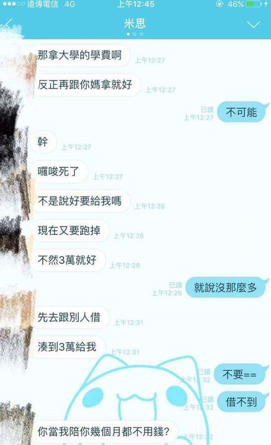 前男友推託說自己沒錢,可拜金女還要他「拿大學的學費啊,反正再向你媽拿就好」、「先去跟別人借」,最後乾脆直接撕破臉皮,嗆前男友「你當我陪你幾個月都不用錢?」(怒)