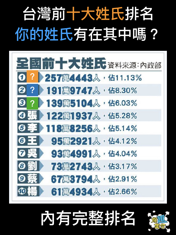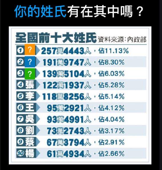 特別值得注意的是,第八大姓的劉姓是老年化最高的姓氏,目前老年人口與幼年人口的比例相當,如果這趨勢持續下去,那劉姓將會疊出十大姓,