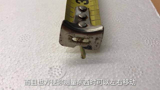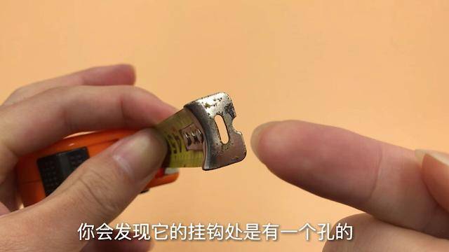 你會發現它的掛鉤處是有一個孔的,這個孔到底有什麼用呢?其實它是用來固定位置的,這樣你就不用另外一隻手,或者到處找人幫你固定捲尺了,而且也方便你測量東西時可以左右移動。