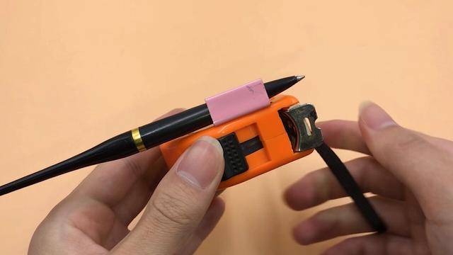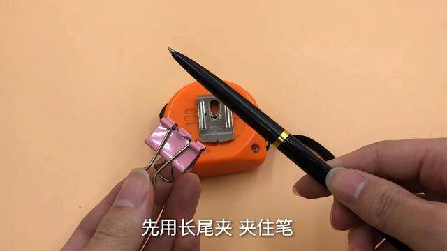 這個夾子不只是用來夾在褲腰帶上的,它還有個很大的作用,先用長尾夾,夾住筆,然後把長尾夾反過來,接著把長尾夾這樣夾在捲尺夾子上,如果測量的東西需要標記記號,就可以用筆直接標記上,一個人就能輕鬆完成測量和標記,非常的方便。
