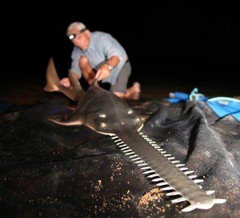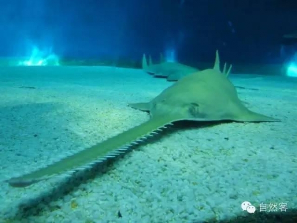 鋸鰩使用巨大的“鋸”像耙子一樣篩濾水底沙子尋找食物。