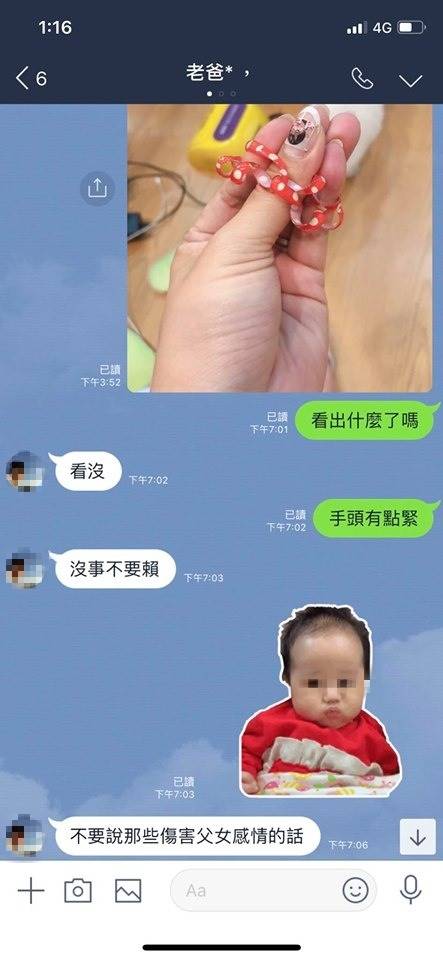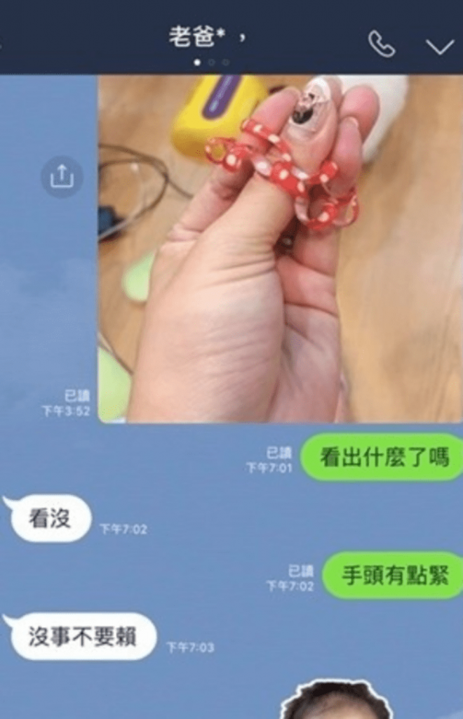 一名女網友在臉書社團PO出一張對話截圖;照片中顯示,原PO將手用髮箍之類的小東西纏起,詢問爸爸說「看出什麼了嗎」,對方則滿頭問號回「看沒」。