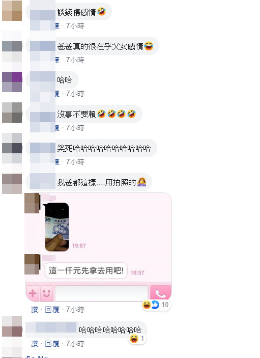 網友留言「爸爸真的很在乎父女感情」、「笑死,神提問,神回覆」、「厲害的爸爸神回覆」、「我爸都跟我說:說到錢我倆沒有明天」、「果然是親爸」、「一定要讓我家孩子看到這篇」