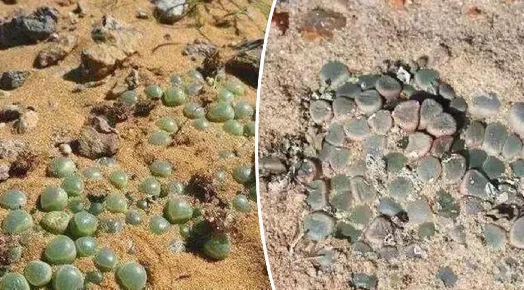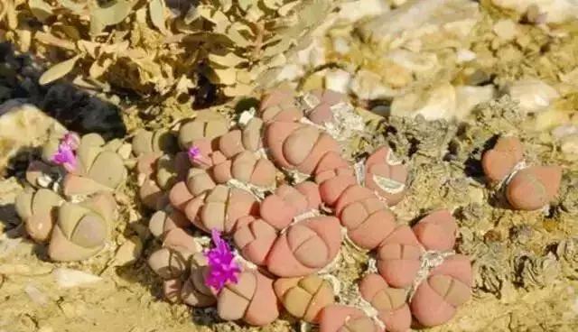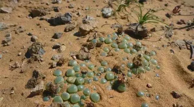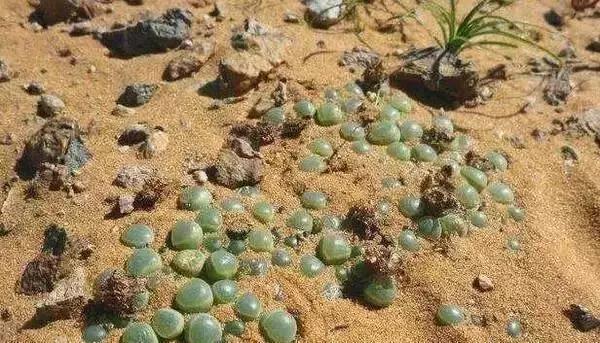 其實,這種「玉石」是一種被稱為五十鈴玉的多肉植物,它表麵上看上去就像一顆顆翠綠的玉石一樣,而且這種植物都生活在乾旱的沙漠地區,他們一會一般只會將頂部一小部分露出地麵,大部分地區是埋藏在沙土裡麵的