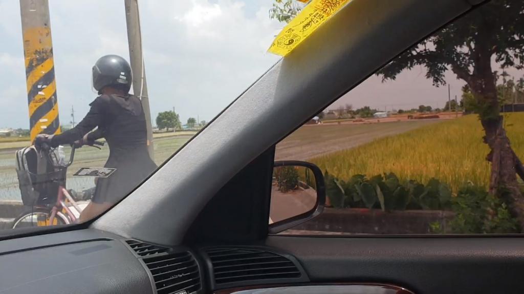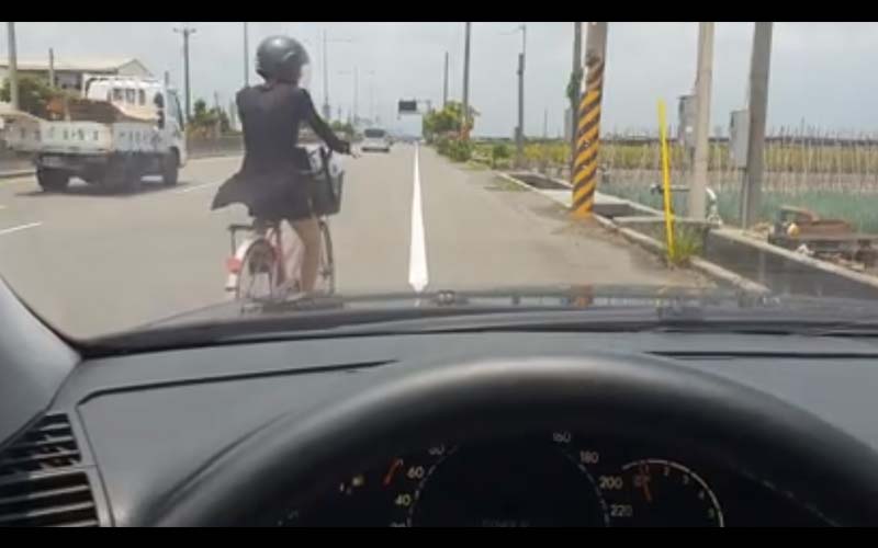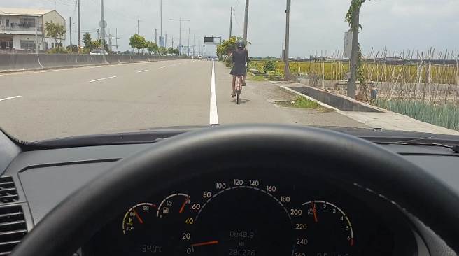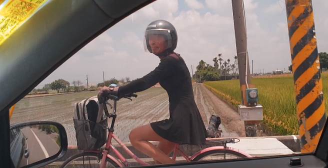 「怎麼會有可愛的女孩子,戴著安全帽,在荒郊野外騎單車?」,廖姓會長深感納悶,開車向長腿妹駛近,結果與長腿妹四目交對瞬間,會長卻嚇得有如驚弓之鳥,趕緊加速油門離去。