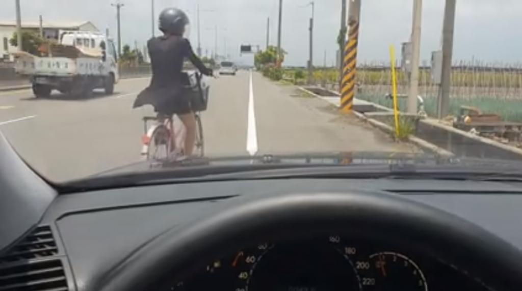 嚇歪了!彰化一名廖姓民眾日前從雲林開車返程途中,發現前方有位身材曼妙、逆天長腿的「正妹」騎著淑女車趴趴走,頭上還戴了一頂安全帽,民眾被眼前的「長腿妹」奪住目光,好奇地超車一睹對方真面目,但當「她」一轉頭,民眾嚇得直呼要收驚…。