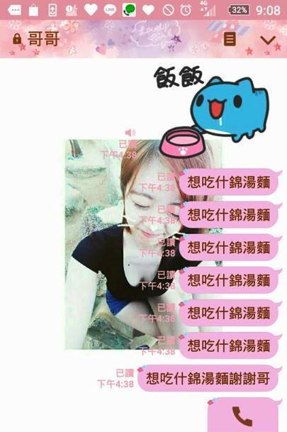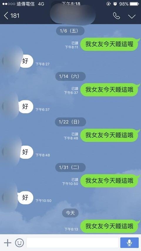 在近1個月的時間內,哥哥大致維持著一星期傳訊1次的頻率,內容都是「我女友今天睡這哦」
