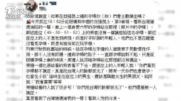 日前一名女網友就在臉書「爆料公社」表示,自己乘坐台鐵板橋到中壢的自強號時,看見一名身懷六甲的年輕媽媽站在車廂走道,「附近座位的乘客沒有一個願意讓位給這一名孕婦,他們都不是什麼老弱病殘,而是好手好腳的年輕人,也不是在睡覺沒有看見孕婦,而是有說有笑的在玩手機。」