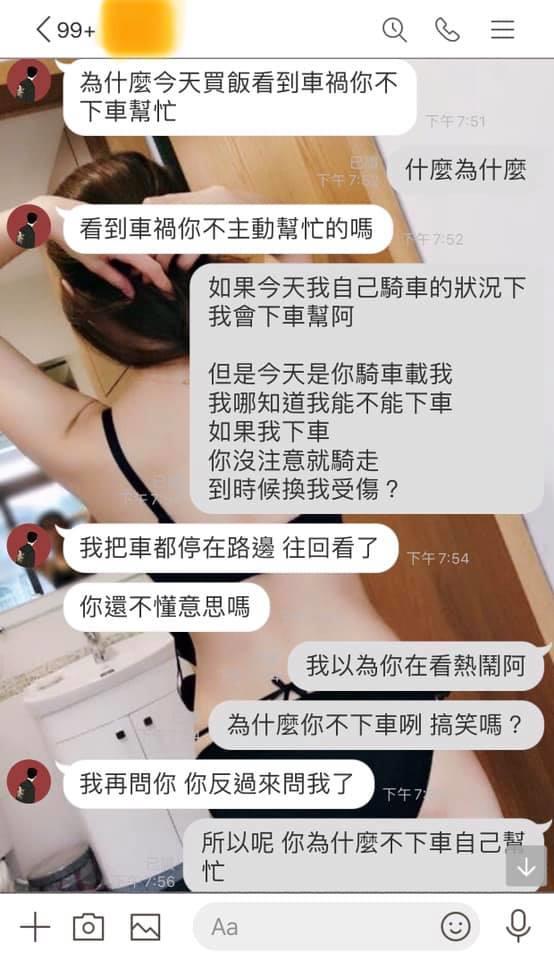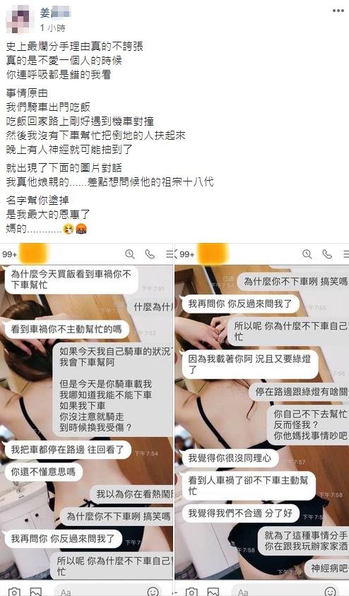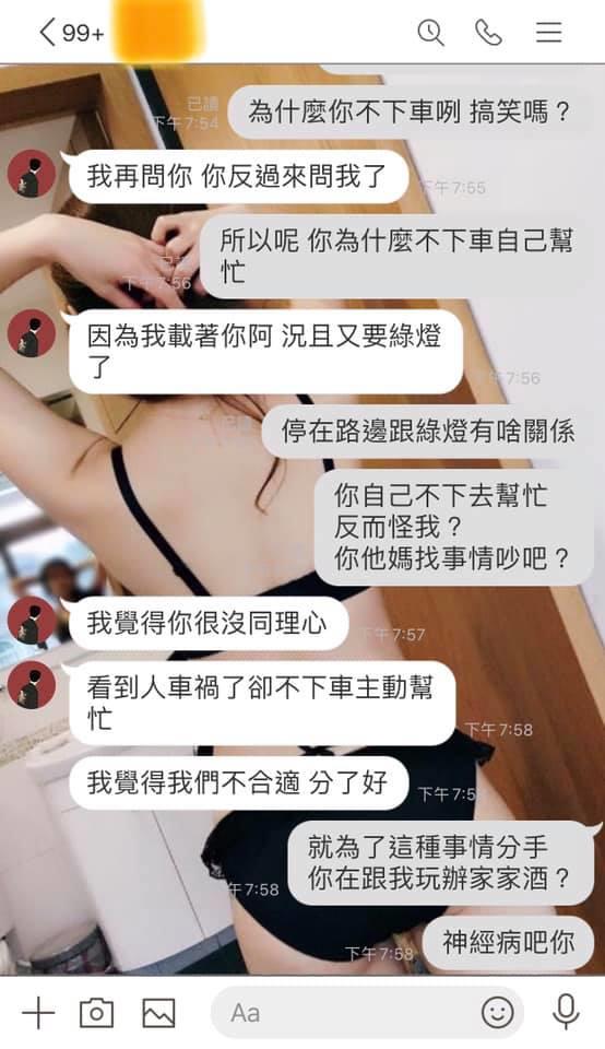 「真的神 經 病 而且他停下車後他有跟你講說 你要不要去幫忙嗎?他停下車 沒開口 要你通靈是嗎?有嘴巴不會講話只會事後傳LINE???真的恭喜你分了剛好」