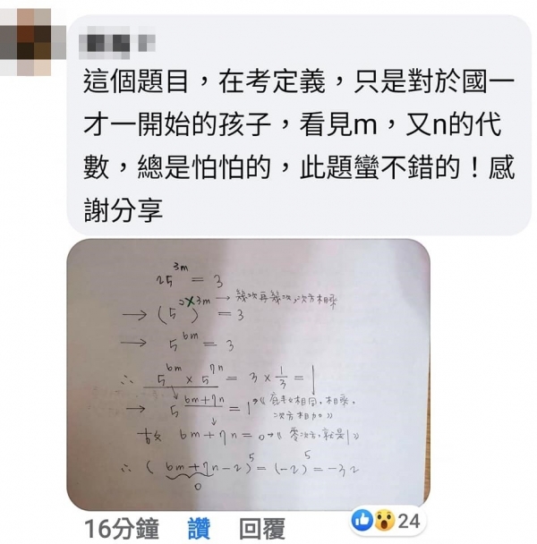 不過在一片崩潰下,還是有人順利算出答案,指出其實這一題考的是定義,並不是真的有多難的計算過程,「這個題目,在考定義,只是對於國一才一開始的孩子,看見m,又n的代數,總是怕怕的」、「其實真的是國一內容,一個簡單的觀念而已,只是算式會嚇人。」