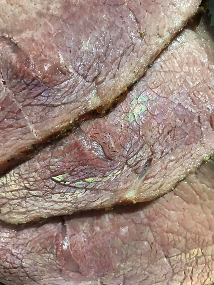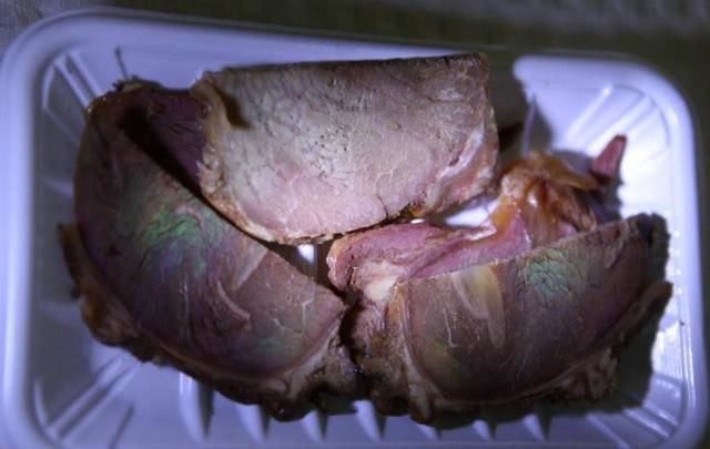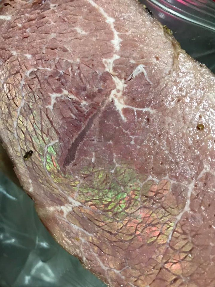 牛肉怎麼會出現這樣綠綠粉粉的神祕光澤?這種光澤有著金屬感,看照片更像是魚鱗、孔雀羽毛會反射出的顏色!看看冰箱裡剩下的也都是這樣,不過牛肉聞起來沒有臭味,是壞了嗎?可以吃嗎?