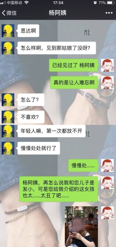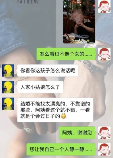 阿姨事後還傳訊息問進度,男網友忍不住回,「介紹的這女孩也太酉鬼了吧…」阿姨還教導他,結婚不能找太漂亮的,不可靠。還說她一看這個女生就不錯,是會過日子的。