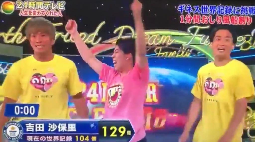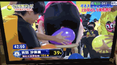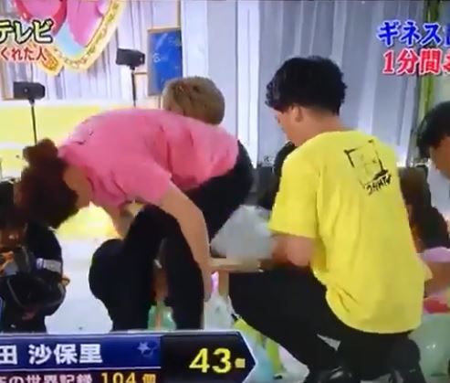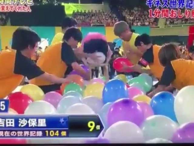 在兩位喜劇演員的幫助下,吉田沙保里在短短60秒內坐爆了129顆氣球。