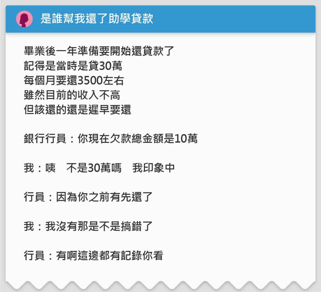 不少新鮮人畢業後,還背負著數10萬的就學貸款;一名女網友在Dcard發文提到,畢業後要還30萬元學貸,但日前到銀行卻發現只剩10萬欠款,讓她覺得奇怪怎麼少這麼多,後來得知真相後,忍不住淚如雨下。