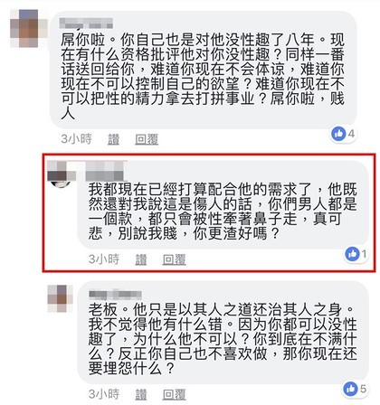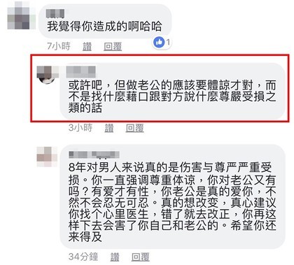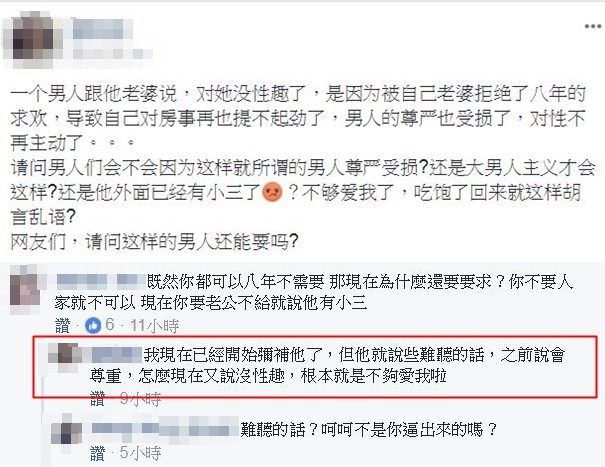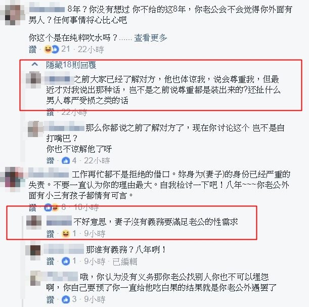 她以為網友們會站在她那一邊,沒想到大家紛紛批評她,覺得她太過分:「惡人先告狀」、「我不覺得他有什麼錯」、「還8年,抗戰嗎」「人家8年都沒抱怨了,你被拒絕一次就森77」、「妳試試一樣東西妳很想得到,一直跟妳老公討,討了8年被拒絕8年,妳還會有慾望嗎?將心比心吧」