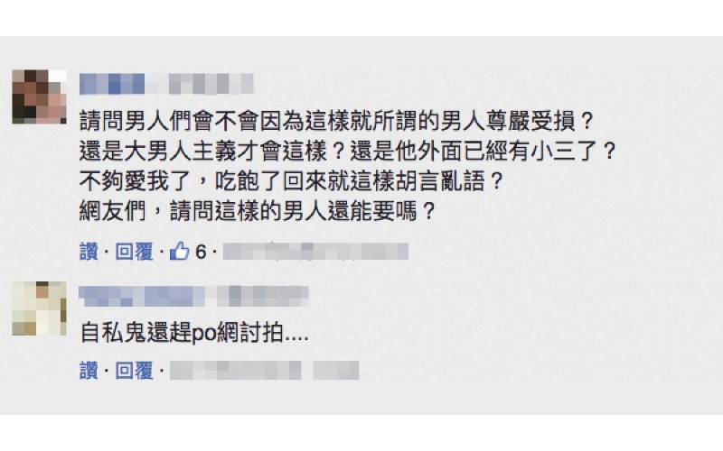 一般人聽到另一半說這樣的話,應該會反省一下,這名女子卻在臉書PO文痛斥老公:「請問男人們會不會因為這樣就所謂的男人尊嚴受損?還是大男人主義才會這樣?還是他外面已經有小三了?不夠愛我了,吃飽了回來就這樣胡言亂語?網友們,請問這樣的男人還能要嗎?」