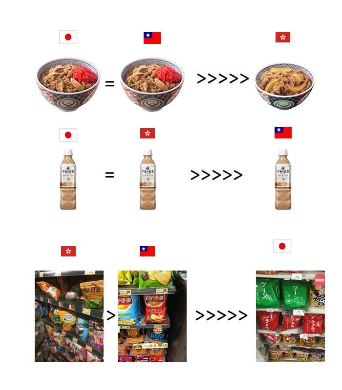 三地的吉野家、午後の紅茶、洋芋片的比較:
