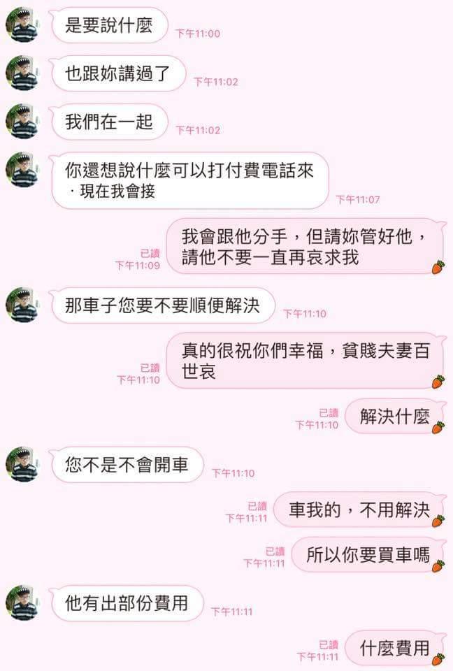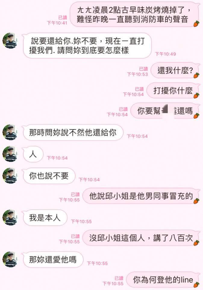 現在又冒出了邱小姐,邱小姐用他的電話,用他的line跟我嗆聲她是正牌女友,要我不要再跟渣.男聯絡。(但邱小姐是渣.男死纏我不放)。