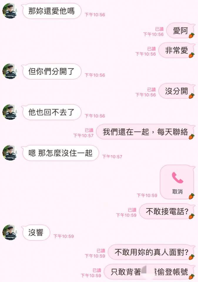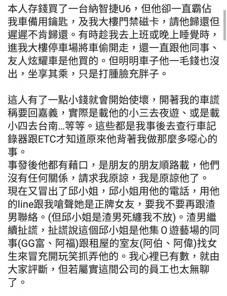 渣.男繼續扯謊,扯謊說這個邱小姐是他集0遊藝場的同事(GG富、阿福)跟租屋的室友(阿伯、阿偉)找女生來冒充開玩笑抓弄他的。我心裡已有數,就由大家評斷,但若屬實這間公司的員工也太無聊了。