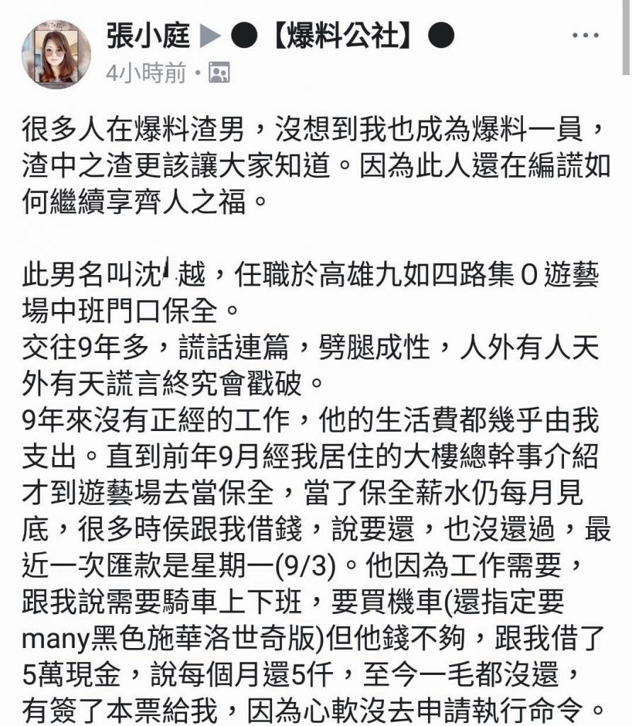 直到前年9月經我居住的大樓總幹事介紹才到遊藝場去當保全,當了保全薪水仍每月見底,很多時侯跟我借錢,說要還,也沒還過。