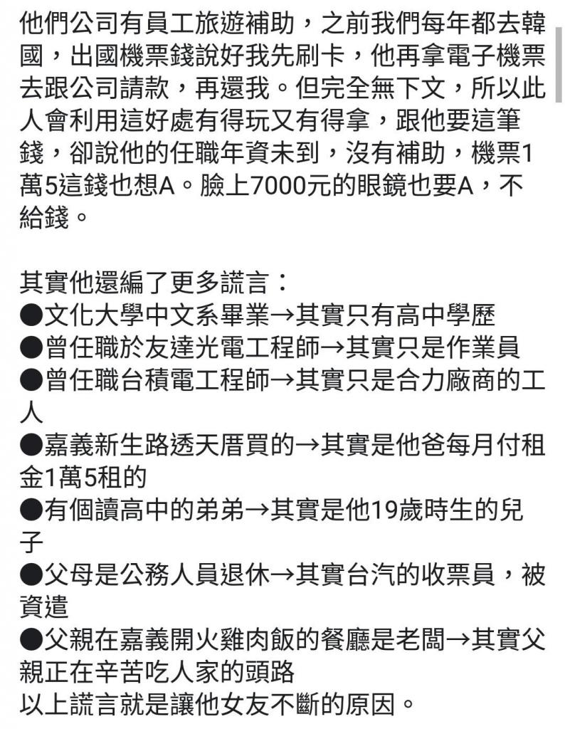●父親在嘉義開火雞肉飯的餐廳是老闆→其實父親正在辛苦吃人家的頭路以上謊言就是讓他女友不斷的原因。