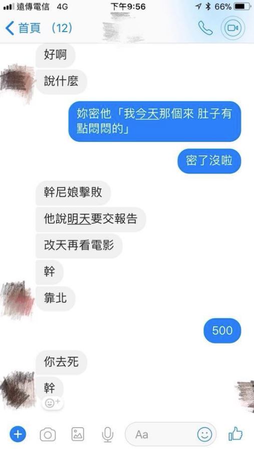 一看女兒馬上答應,老爸接著就說:「妳密他『我今天那個來,肚子有點悶悶的』。」果然不出所料,女兒下一秒立刻回覆,表示「他說明天要交報告,改天再看電影,X!」只用一句話就幫女兒把爛 桃花斷光光XD