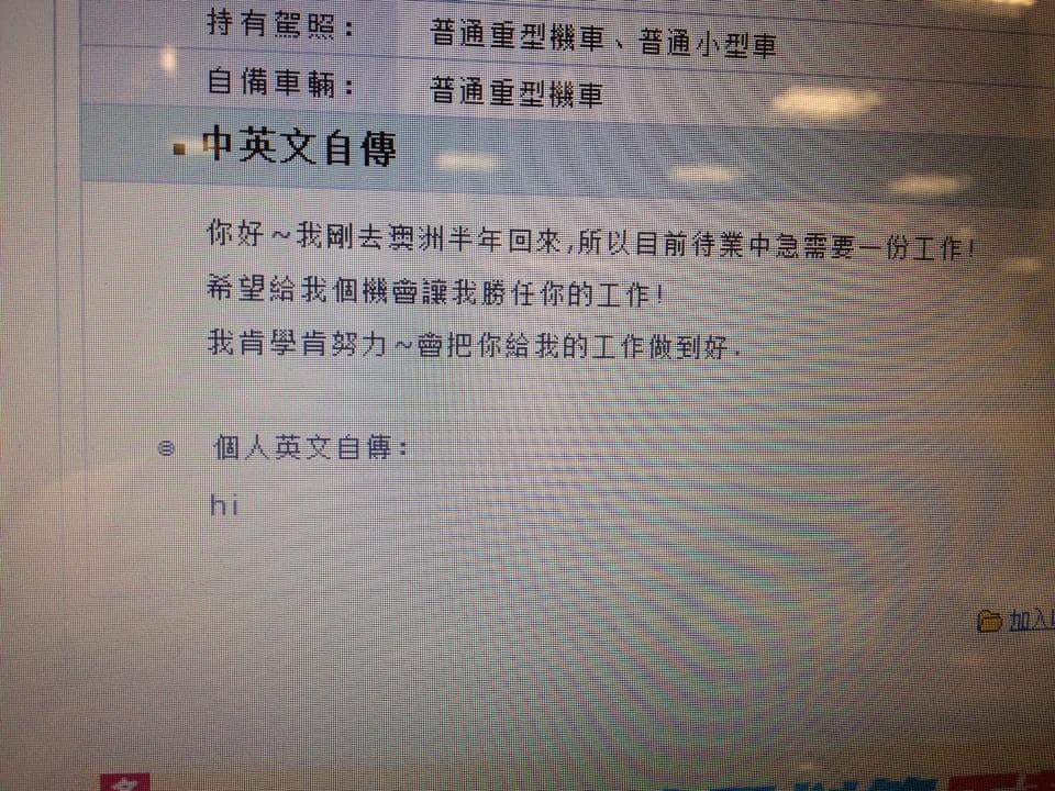 據了解,一名網友在「爆廢公社」發文並附上照片,從求職履歷的截圖中可見,中文自傳裡頭提到自己去澳洲半年剛回來,目前急需一份工作,最後也非常誠懇地說,「希望給我機會,讓我勝任你的工作!我肯學肯努力~會把你給我的工作做到好」,可以感受到他對於這份工作的渴望,可是他卻在英文自傳中只寫了「hi」,讓原PO忍不住笑出來,「這英語程度應該可以錄取!」