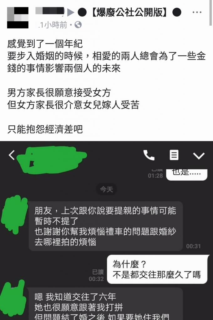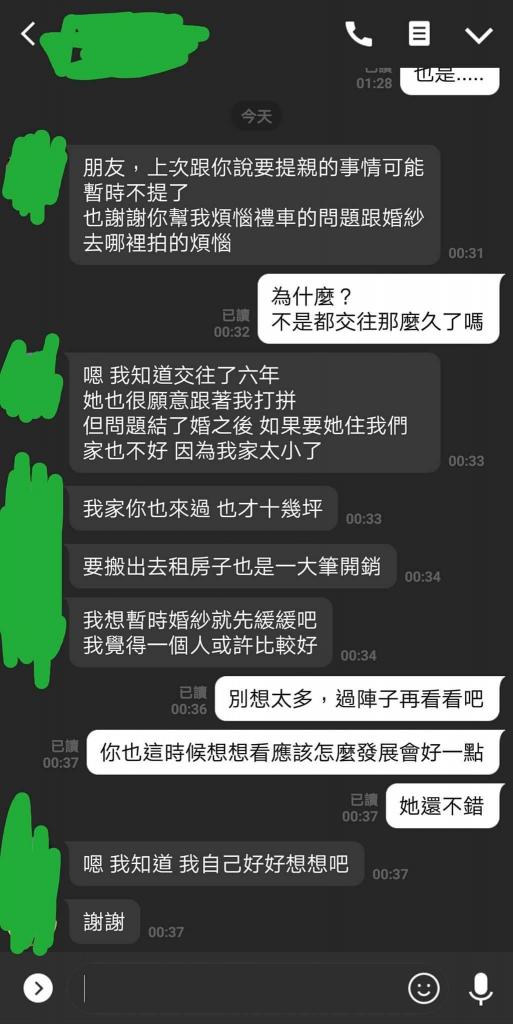 「你文章說女方家怎樣結果你圖裡是男方家跟你對話…有點讓人不舒服啊…奉勸那位先生你不娶就快放手,但如果真是對方嫌棄你,你也快放生吧,我不明白怎麼有人會這麼在意自己家小然後放棄真愛,不能婚後搬出去兩人租一間?不懂,感情不是你隨便走出去就能遇到兩情相悅的誒。 」