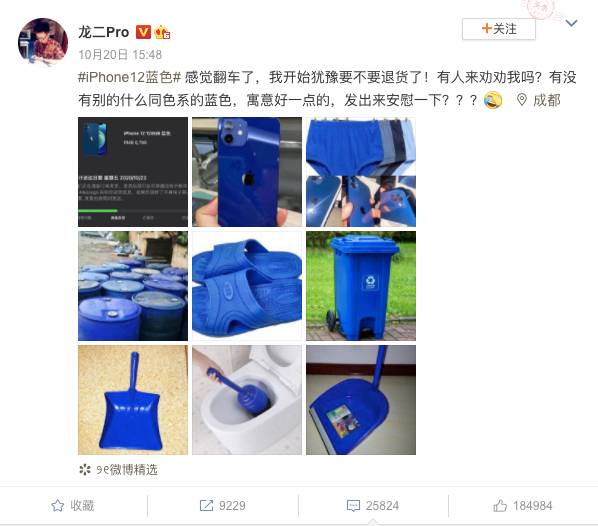 中國一位科技部落客龍二PRO昨(20)日發文表示,在看到實體機的顏色後猶豫要不要退貨。底下網友紛紛回應「不是一般的醜」、「內褲藍」、「原來是今晚在宜家買的購物袋」。也有網友幫忙安慰,「相信我,這絕對是拍的人的問題」。