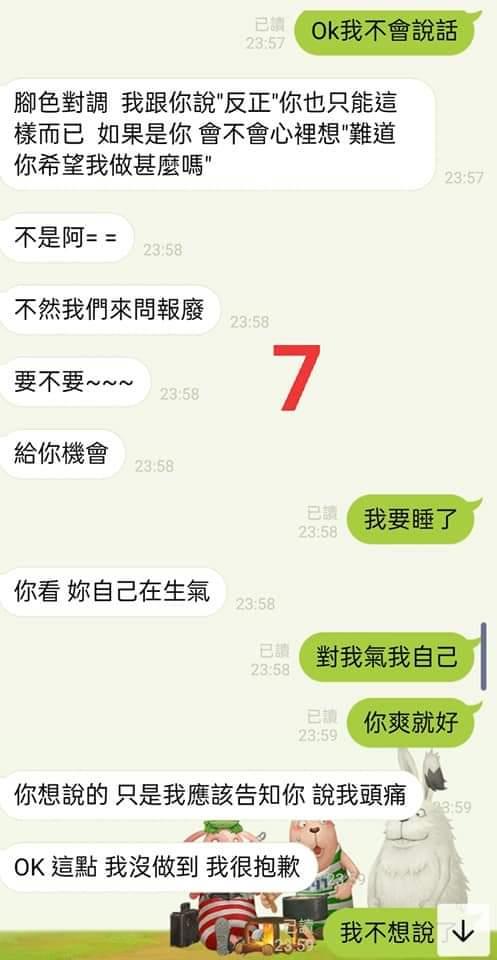 「男生願意打這麽多字跟你溝通已經很不錯了,女生不是不會講話,是明明在生氣了才會講出那些話,男生是在溝通觀念及未來再發生類似事件時兩人互相怎麼做才最好,而女生整個沒得到男生好言應對而惱羞,男生這個性女生早就知道並喜歡的不是嗎?只是因為劇本沒按自己的發展就不爽,回的那句溝你媽,男生沒生氣已經很有風度。」